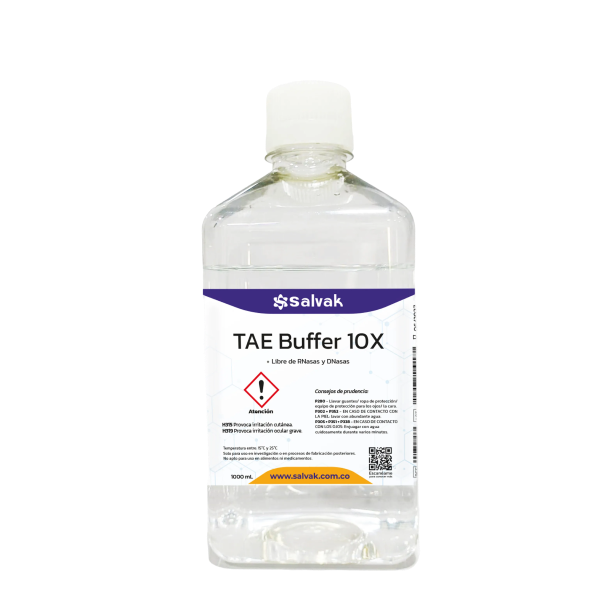 El Buffer TBE 10X de Salvak es una solución tamponada utilizada para la preparación y corrida de geles de agarosa y poliacrilamida en técnicas de electroforesis. Su formulación está optimizada para aplicaciones de biología molecular, ofreciendo una alta capacidad de amortiguación y excelente resolución en la separación de fragmentos de ADN. , Caracteristicas producto / condiciones de producción Formulado con agua ultrapura libre de nucleasas (DNasas, RNasas y ADN).